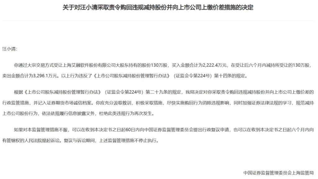此外,北交所当天还公开了一份纪律处分决定书,同样涉及违规减持股份,与汪小清有关。纪律处分决定书显示,汪小清除了违规减持艾融软件外,还违规减持了华信永道、百甲科技。据悉,汪小清9月27日至10月8日期间,通过大宗交易方式受让华信永道、艾融软件、百甲科技等3家上市公司持股5%以上股东的股份,合计受让股份243.9万股;后于9月30日至10月9日期间,通过二级市场卖出其受让的华信永道、艾融软件2家公司的全部股份及百甲科技的部分股份,合计卖出股份 224.9万股。