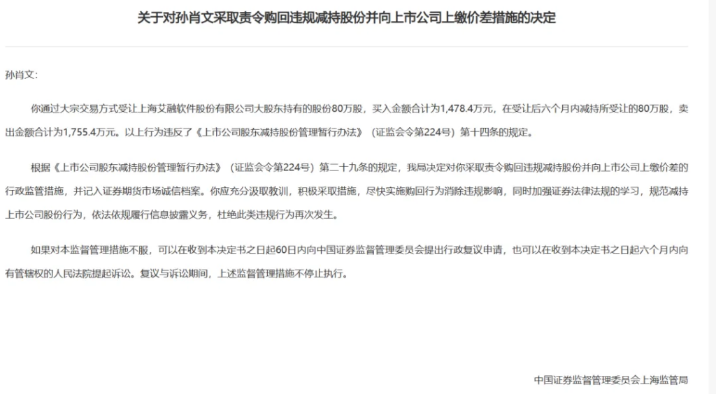 北交所当天公开的自律监管措施显示,经查明,魏昌伟10月8日通过大宗交易方式受让鑫汇科持股5%以上股东持有的26万股股份,并于10月9日通过二级市场全部卖出;孙肖文10月8日通过大宗交易方式受让艾融软件持股5%以上股东持有的80万股股份,并于10月9日通过二级市场全部卖出。